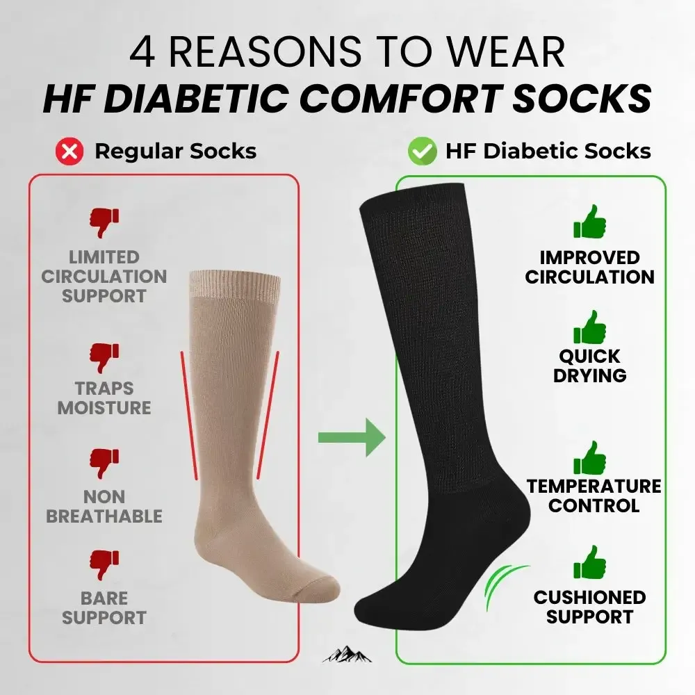 HF Diabetic Comfort Socks feature a comfy, non-binding, loose top design to improve blood flow and reduce swelling, especially for individuals with diabetes. This circulation-friendly feature ensures you can move comfortably and confidently, whether you’re on your feet all day or relaxing at home.